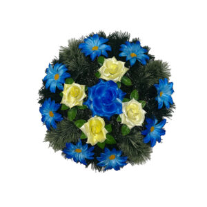 Diametru: 50 cm Coroana funerara artificiala coronita plina cu flori din cadru metalic si fire de brad + pin artificial