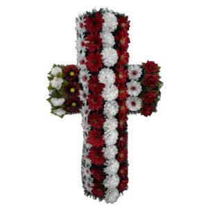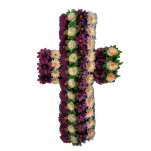 Inaltime: 120 cm Coroana funerara artificiala in forma de cruce cu flori din cadru metalic si fire de brad artificial